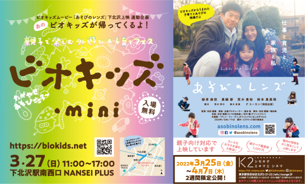 親子で楽しむ外遊び&子育てフェス「ビオキッズ」https://biokids.net/(主催:ビオキッズ実行委員会 事務局:株式会社シナプス)は、3月27日(日)に初開催の「下北線路街 キッズデイ」の一部として親子向けイベント「ビオキッズ・mini」を開催します。また、3月25日(金)~4月7日(木)には、ビオキッズ実行委員会が製作した映画「あそびのレンズ」も隣接するミニシアターで上映、トークイベントも実施。映画の生まれた世田谷区で子どもを真ん中に「地域で子育て」「あそびと育ち」を体感していただける一日です。