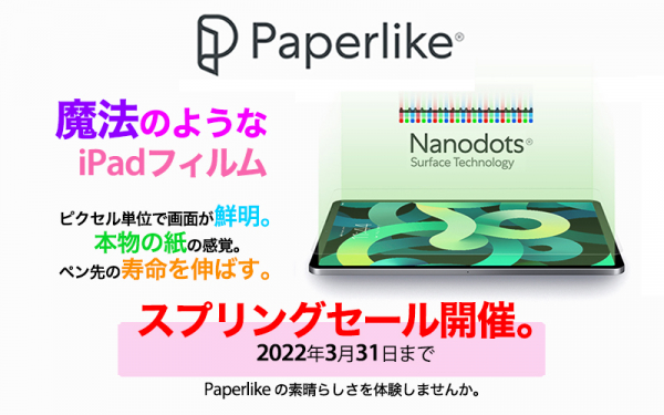 エリーゼジャパン合同会社(神奈川県横浜市 代表:ニコラ コタール)は、業界初の本物の紙の感覚と同時に画面を鮮明に再現するiPad用フィルム「Paperlike」が15% OFFになるスプリングセールを正規販売店で2022年3月31日(木)まで開催中です。