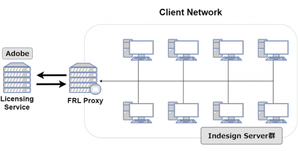 FRLオンラインプロキシサービスは、外部に接続できないイントラネットワーク上のAdobe InDesign Serverからの認証リクエストをオンラインプロキシサーバーが仲介することで、Adobeライセンスサーバーとの認証処理を安全に行うことができるサービスです。
