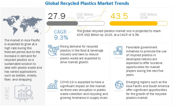 MarketsandMarketsはレポートの公開資料において、再生プラスチック市場は2021年に279億ドル、2026年までには435億ドルに達し、2021年から2026年までのCAGRは9.3%で成長するとの予測結果を発表しました。