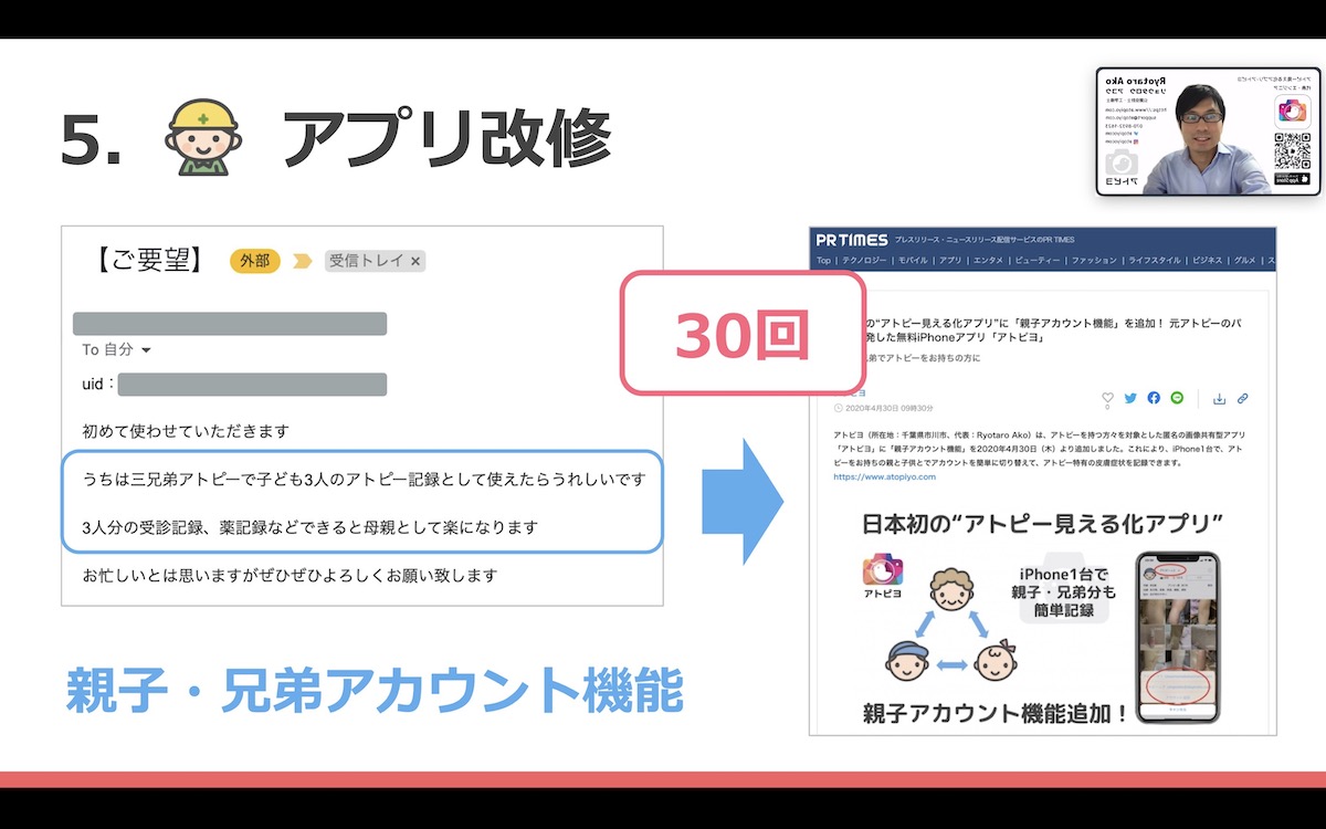 当日は、代表Ryotaro AKOが、アトピー患者さんの課題、アプリ内容と3つの特徴、機能追加と評価、将来ビジョンについて発表いたしました。