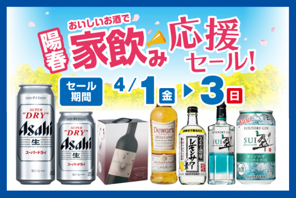 全国に185店舗で酒の専門店をチェーン展開する株式会社リカーマウンテン(本社:京都市)は、4月1日(金)~3日(日)の3日間、深夜営業店舗などを除く一部店舗で「陽春 おいしいお酒で家飲み応援セール」を開催いたします。