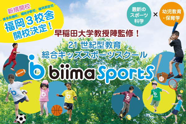 21世紀型総合キッズスポーツスクール「biima sports(ビーマスポーツ)」(社名:株式会社 biima、本社:東京都渋谷区、代表取締役:田村恵彦)は、2022年4月に、新たに「株式会社スポーツ企画スプラージ」(社名:株式会社スポーツ企画スプラージ、所在地:福岡県福岡市博多区、代表取締役:元木祐輔)とパートナーシップ契約を締結し、福岡県に博多金隈校、福岡伊都校、福岡新宮校を新規開校いたします。福岡県には初の進出となり、全国150カ所以上の展開となります。