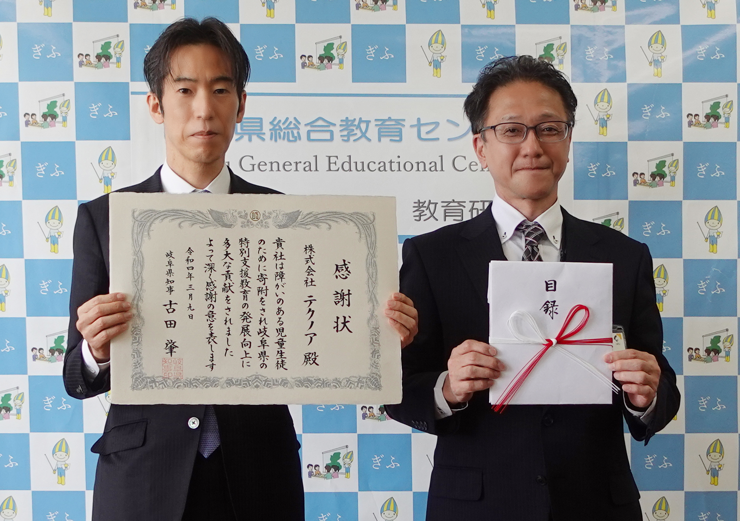 ソフトウェア開発の株式会社テクノア(本社:岐阜県岐阜市、代表取締役:山﨑 耕治)は、特別支援教育の発展向上を支援するため、岐阜県教育委員会(岐阜県岐阜市薮田南2丁目1番1号、教育長:堀 貴雄 様)へiPad 74台を寄贈しました。2022年3月30日(水)、岐阜県総合教育センター(岐阜市薮田5-9-1)にて寄附目録を贈呈し、知事感謝状を受領しました。