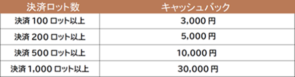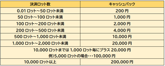 期間中に100 ロット以上決済取引されたお客様にもれなくキャッシュバック(最大3万円)いたします。