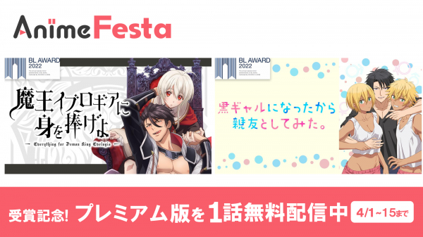 この度、ウェイブのオリジナルアニメ作品群「AnimeFestaオリジナル」より「魔王イブロギアに身を捧げよ(7位)」「黒ギャルになったから親友としてみた。(10位)」の2タイトルがBLアワード2022 BEST映像を受賞しました。