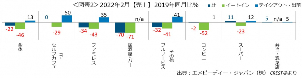 外食・中食市場の2022年2月は、売上21.5%減(2019年同月比)