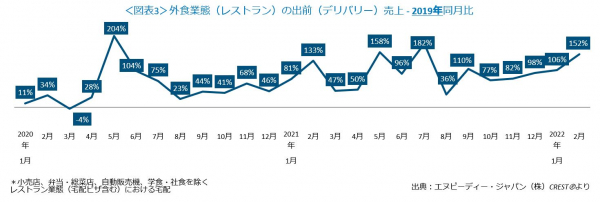 外食業態計(レストラン計)の売上2019年同月比を利用形態ごとにみてみると(図表3)、出前(デリバリー)の大幅増が続いています。デリバリー増加のピークは2020年5月の204%増ですが、その後も2ケタ増が続き、特に2021年2月(132%増)、同5月(159%増)、同7月(181%増)、さらに同9月も109%と大きく伸びました。年が明けて、2022年1月は106%、今月(2022年2月)は152%と2ヶ月連続で3ケタ増となりました。