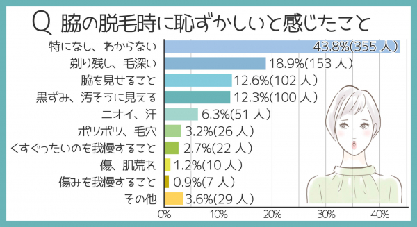 また脇は普段隠れている部分だけに、脱毛時にじっくりと見られることに「恥ずかしい」と感じる方も多いようです(12.6%(102人))。