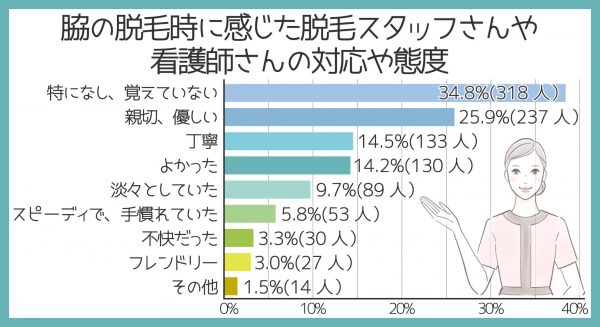 さらに、脱毛時に脱毛スタッフさんや看護師さんが脇の黒ずみを見てどう感じているかを知るために、スタッフさんらの対応や態度についてもお聞きしました。