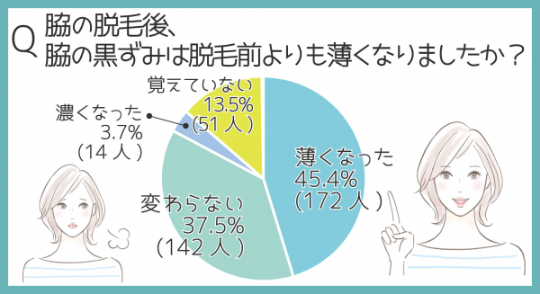 脱毛後、脇の黒ずみが「薄くなった」は45.4%(172人)、「変わらない・濃くなった」は合わせて41.2%(156人)という結果が出ました。