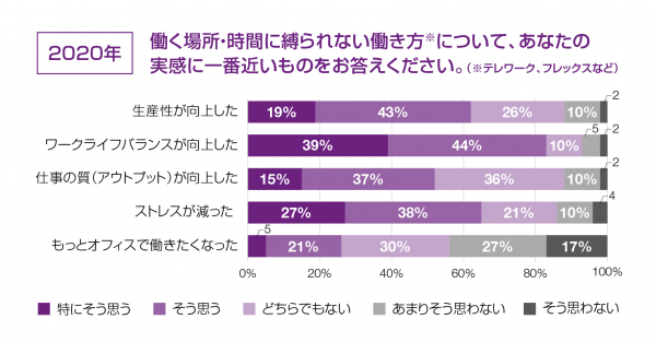 コロナ感染対策の在宅勤務を経験した会社員551人に、テレワークなど働く場所・時間に縛られない働き方を経験しての実感を聞いたところ、82%が「ワークライフバランスの向上」、66%が「ストレスの軽減」を実感していたことがわかりました。「生産性」についても63%が向上を実感。「仕事の質・アウトプット(成果)の向上」については、およそ半数が実感ありと答えた反面、残り半数は向上の実感はないと回答したことから、「仕事の質・アウトプットには変化なし」の傾向にあることがうかがえます。また、約4人に1人は「オフィスで働きたい」(24%)と実感していたこともわかりました。