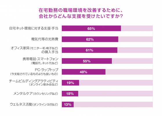 会社から受けたい支援:1位「自宅のネット環境」、2位「電気代等の光熱費」、3位「オフィス家具購入」