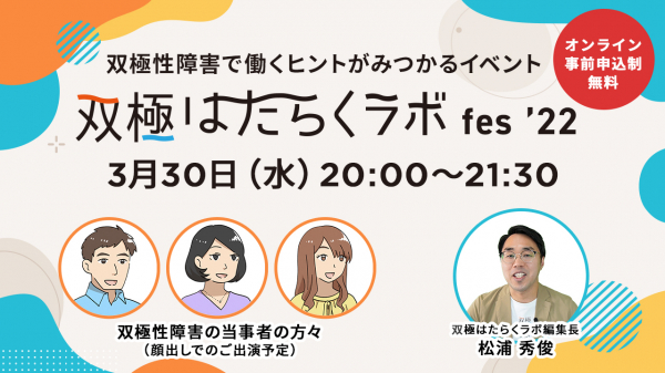 うつや双極性障害※1.の方の復職・再就職支援サービス等を展開する株式会社リヴァ(本社:東京都豊島区、代表取締役 伊藤崇)は、3月30日(水)「世界双極性障害デー※2.」に、双極性障害と働くをテーマにしたオンラインイベント「双極はたらくラボ fes’22」を開催しました。