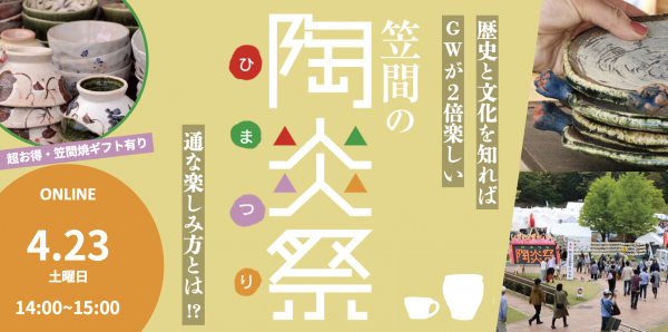 「祭りで日本を盛り上げる!」をミッションとし、全国の祭りの多面的なサポートを行い地域活性化に取り組む株式会社オマツリジャパン(代表取締役社長:加藤 優子、所在地:東京都渋谷区、以下オマツリジャパン)は、笠間焼協同組合(理事長:大津 廣司、所在地:茨城県笠間市)とともに、4月23日(土)に笠間の陶炎祭(ひまつり)をもっと楽しくするオンラインイベント「歴史と文化を知ればGWが2倍楽しい! 「笠間の陶炎祭」の“通”な楽しみ方とは?!」を開催します。