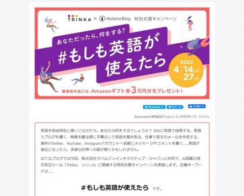 学術英語トータルソリューションを提供する株式会社クリムゾンインタラクティブ・ジャパンと「はてなブログ」が共同で、AI搭載英文校正ツール「Trinka」(トリンカ)に関連する特別お題キャンペーンを実施。