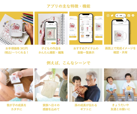 子どもが何気なく描いた絵や一生懸命描いたとっておきの一枚。そんな大切な絵からつくる、新しいギフトのカタチ。tukutte(ツクッテ)は、お手頃価格 341円(税込)~子どもが描いた絵を我が子オリジナルのグッズにできるモバイルオーダーサービスです。