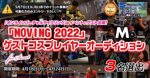また、本イベントは毎回多数のレース参加ゲストをむかえて行っています。今回は初めてコスプレイヤーさんをゲストにむかえることになりました。つきましては「MOVING 2022」とClaps!がコラボして、「MOVING 2022 ゲストコスプレイヤーオーディション」を開催し、決定いたします。