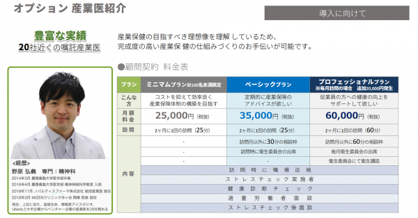 ・ベーシックプラン:月額35,000円。定期的に産業保健のアドバイスをします。