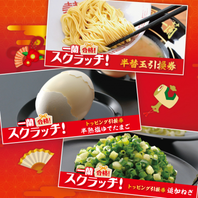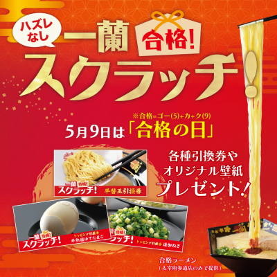 株式会社一蘭(天然とんこつラーメン専門店/創業:昭和35年/本社:福岡県福岡市博多区/代表取締役社長:吉冨学/https://www.ichiran.com)では、本日4月25日(月)より期間限定で「一蘭 合格スクラッチ」を実施いたします。期間中、一蘭公式アプリ内で1日1回スクラッチに挑戦すると、各種引換券や合格壁紙などがもれなく当たります。本イベントは一蘭の申請により日本記念日協会に認定された記念日『合格の日(5月9日)』にちなみ、受験生はもちろん、これから試験を受ける方や何かに挑戦される方など、頑張る皆様を応援したいという想いから実施いたします。なお、今年の開催が4回目です。