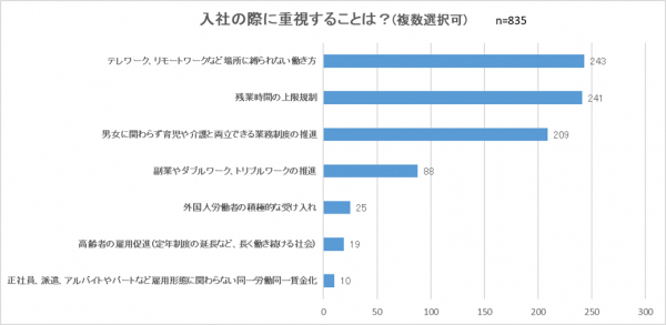 「入社の際に重視する項目はありますか?(3つまで選択)」という質問に対して、学生の選択1位は「テレワークやリモートワークなど場所にとらわれない働き方」で243名の回答となり、前回調査1位の「残業時間の上限削減」の241名をわずかながら上回りました。また、3位は「男女に関わらず育児や介護と両立できる業務制度の推進」で209名。4位は「副業やダブルワーク、トリプルワークの推進」で88名となりました。