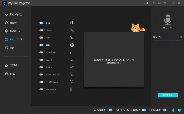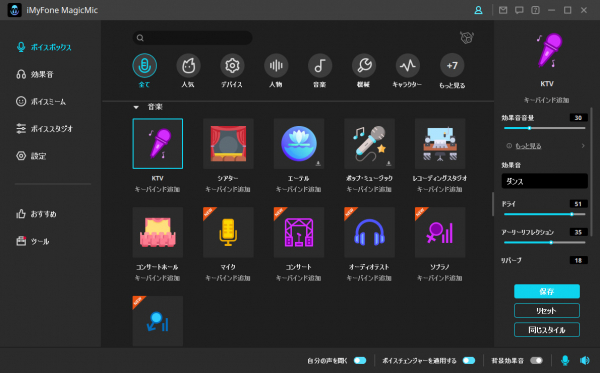 エコーやノイズなど基本的な音声設定が自由に調整し保存できて、好きな音声効果を作成するといつでも使えます。