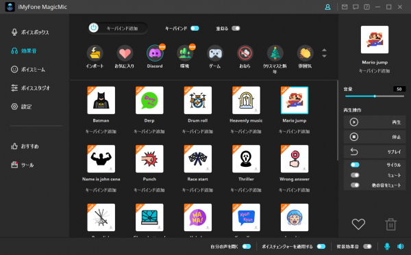 マリオジャンプや笑い声、銃声など、DiscordやFortniteのようなゲームと通話プラットフォームに人気がある効果音は100種類ほど増加されました。今は総計300個以上の音声効果があるが、各種のボイスチャット需要が満足できます。