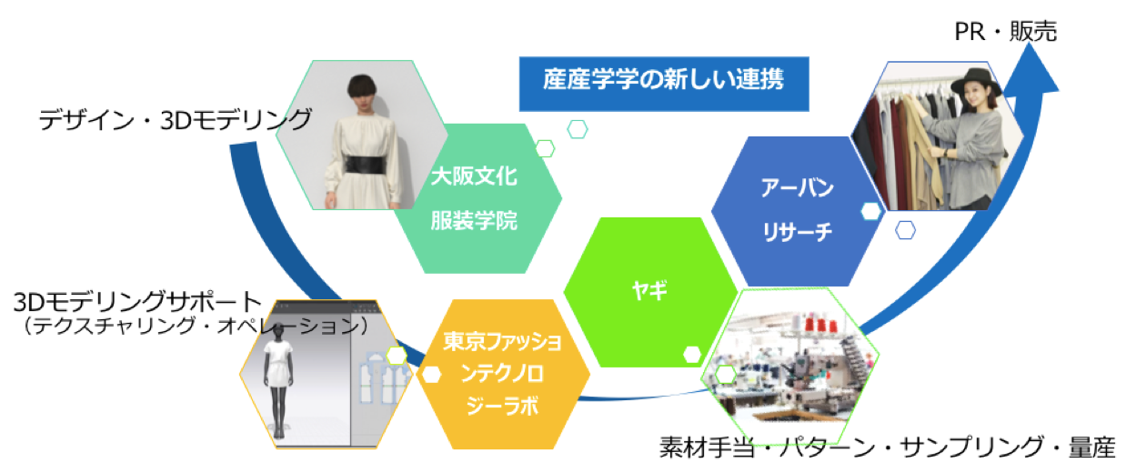 ファッションテック専門スクール「東京ファッションテクノロジーラボ(略称:TFL)」(代表:市川雄司 所在地:東京都渋谷区神宮前)は、教育提携した「学校法人ミクニ学園 大阪文化服装学院」(理事長:岩﨑一哉 所在地:大阪市淀川区三国本町)と、繊維商社の「株式会社ヤギ」(代表取締役 : 八木隆夫 所在地:東京都中央区/大阪市中央区)、大手アパレルメーカーである「株式会社アーバンリサーチ」(代表取締役:竹村幸造 所在地:大阪市西区京町堀)と共に2021年5月より手掛けていた「3Dモデリングを活用した商品企画からの商品化」を目指す【産産学学プロジェクト】にて、商品化を実現しました。これに伴い、2022年4月25日以降、株式会社アーバンリサーチの公式オンラインストアをはじめ、近畿圏を中心とした各店舗にて販売がスタートいたします。