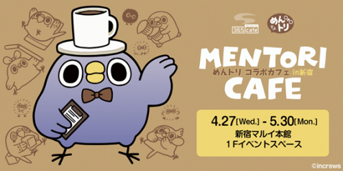 株式会社インクルーズ(東京都渋谷区、代表取締役 山﨑 健司)は、当社が提供するLINEスタンプ「面倒だがトリあえず返信」から生まれた大人気キャラクター「めんトリ」のコラボカフェが「新宿マルイ本館」にて、4月27日(水)より5月30日(月)までの期間限定で開催されることをご報告させていただきます。