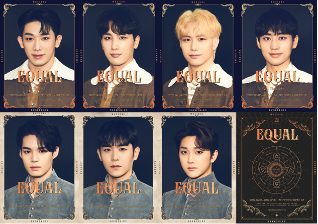 K-ミュージカルを専門にする制作会社(株)SHINsWAVEはミュージカル『EQUAL』のシグネチャーである錬金術表をローズゴールド調にした新たなメインポスターと、17世紀の肖像画をコンセプトにした俳優別のキャラクターポスターを公開した。明るく素直な田舎の医師「テオ」役のウォノ|イ・ヒョンソク|スンシク|キム・ギョンロクの優しく微笑むキャラクターポスターは一際目を惹く。また、 閉鎖された生活の中、死の恐怖に苦しむ「ニコラ」役の セジュン| シン・ヒョクス| ホン・ジュチャンは口を固く閉ざし、鋭い眼差しが視線を釘付けにさせる。
