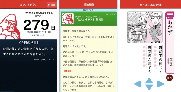 またゴロゴブックスでは、ゴロゴシリーズ20冊の無料閲覧に加えて、大学入学共通テスト本試験までの日数が把握できる「カウントダウン」機能と、小テストおよび受験情報の配信を行う「受験指南」の機能をご用意。ほかにも、オフライン状態で使える「新・ゴロゴ古文単語」など、多数の便利な機能を備えております。受験対策はもちろん、共通テスト本番までのモチベーション維持や情報収集にご活用ください。
