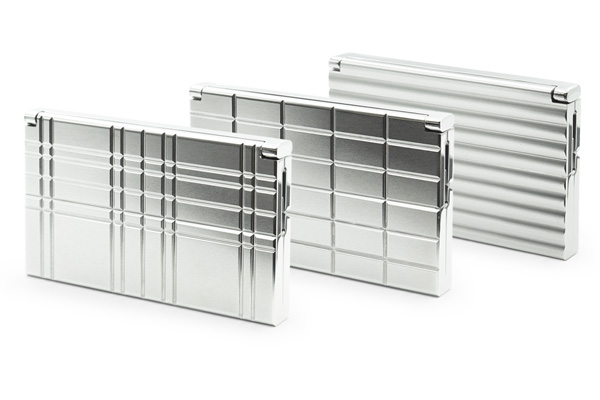 ラインナップは3種。立体的な甲丸形状の断面を並べた「Stripe ストライプ」、板チョコ風のシャープな格子柄「Chocolate チョコ」、タータンチェックを金属で表現した「Plaid チェック」。