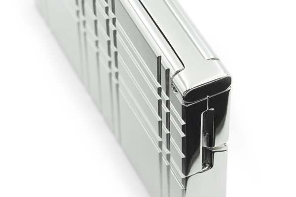 素材は、航空機などにも使われる強固なジュラルミンA2017。無垢材からの削り出し加工で、薄いアルミ板を曲げて作られた製品では表現しにくい、肉厚の強弱によるしっかりとした存在感と高級感を表現しました。