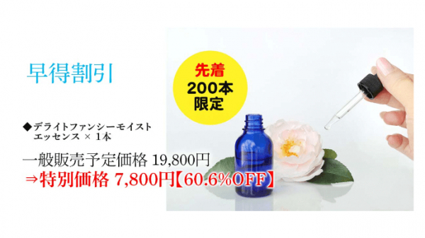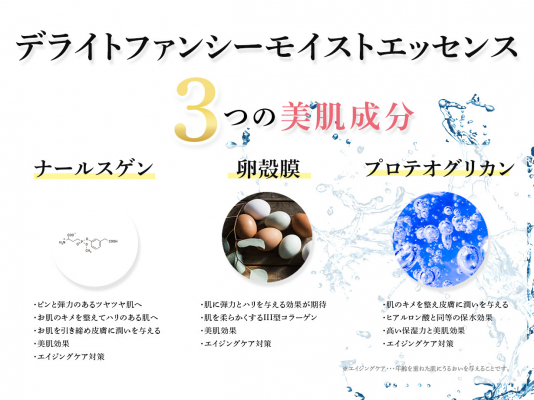 【デライトファンシー モイストエッセンス】は、美容・美肌をとことん追究した美容液で、「ナールスゲン」「卵殻膜」「プロテオグリカン」といった贅沢すぎる成分が配合されています。「ナールスゲン」は、ピンと弾力のあるツヤ肌とお肌を引き締める美容成分、「卵殻膜」は、美肌に欠かせないアミノ酸である「シスチン」が多く含まれている美肌成分、「プロテオグリカン」は、一昔前まで1グラムが3,000万円ともいわれていた高価な美肌成分です。エイジングケア効果をもたらすため、30代から60代以上の方までオススメしたい美容液です。