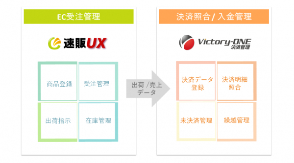本連携により、ネットショップ運営者様は、受注・在庫・商品の一元管理を「速販UX」で行い、入金管理をVictory-ONE【決済管理】で行うことができるようになるので、相互のユーザーに両製品の同時利用を推進すべく、両社で協業を開始いたしました。