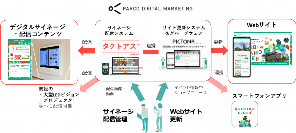 株式会社パルコデジタルマーケティング(本社:東京都渋谷区、代表取締役社長:守永史朗、以下「当社」)は、野村不動産株式会社(本社:東京都新宿区、代表取締役社長:松尾 大作)が2022年4月28日にグランドオープンした大型商業施設【KAMEIDO CLOCK(カメイドクロック)】(以下、カメイドクロック)のデジタル施策を支援しました。全館44拠点へのデジタルサイネージ導入のほか販促用Webサイトも担当。Webサイトとサイネージへ掲示する情報の“自動連携更新”も可能とし、販促強化と労務軽減の両立を実現しています。(事例発表日:2022年5月10 日)