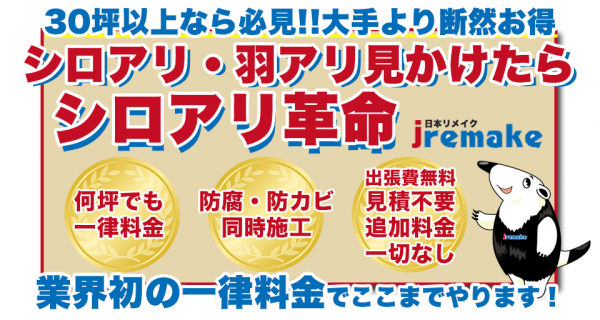 株式会社日本リメイク(所在地:埼玉県さいたま市、代表:鈴木俊雄)は、運営するシロアリ防除・駆除サービス「シロアリ革命」一律15万円(税別)で提供する「シロアリ安心パック(R)」の対応エリアを関東・北関東からさらに仙台・福島・新潟へ拡大いたしました。