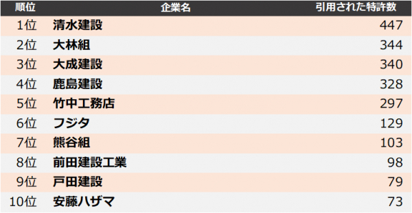 4位 鹿島建設は「異なる作業を行う複数の建設機械を自動運転で作業させることができる建設機械の施工方法」、5位 竹中工務店は「トンネルなどのコンクリートの健全性を、走行しながら非接触で検知し、その剥落危険度を総合的に判断するコンクリート欠陥検査装置」が、最も引用された特許として挙げられます。