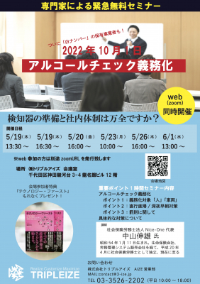 2022年5月19日(木)、株式会社トリプルアイズ(本社:東京都千代田区 代表取締役:山田 雄一郎 以下、トリプルアイズ)は、2022年の10月1日より「白ナンバー」保有事業者もアルコールチェックが義務化されるのに伴い、社会保険労務士法人Nice-One代表の中山伸雄氏を講師に迎え、「白ナンバー」保有事業者向けの緊急無料対策セミナーをリアルとオンラインで同時開催いたします。またこのセミナーは5月19日を第1回として計6回の開催を予定しております。詳細は下記をご確認ください。