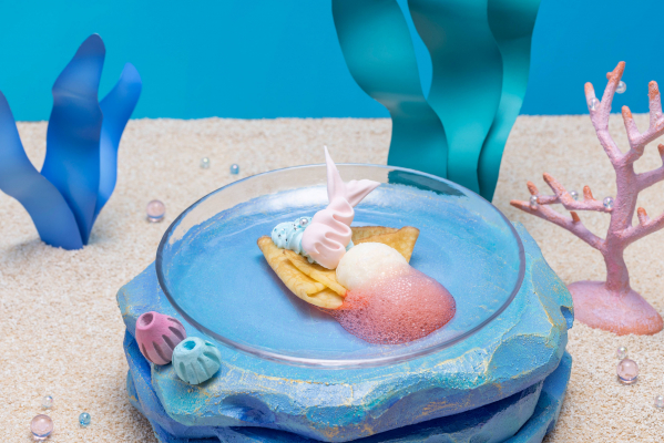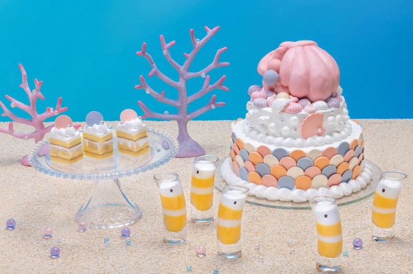 真珠貝をデザインしたピンク色のミニトゥンカロンや、海底からひょっこりと顔を出しているニシキアナゴをイメージした「ニシキアナゴのオレンジ&ミルクのプリン」、白桃と甘さ控えめの生クリームの相性が抜群の「マーメイドの白桃ショートケーキ」など、涼やかな海の世界をテーマにしたデザートを約20種類ご用意します。