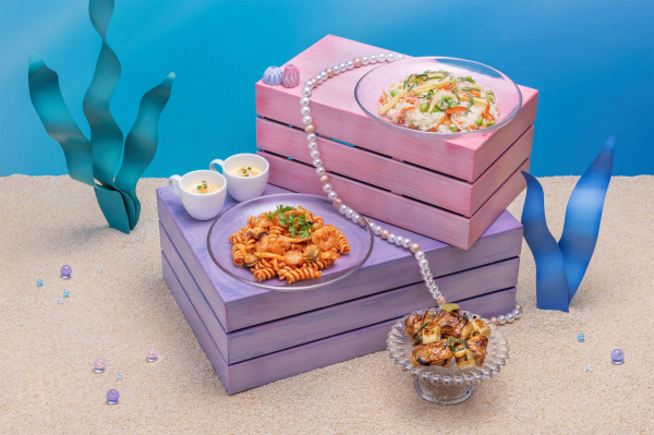 最上階までの吹き抜けが開放的な「ラウンジ・オー」のビュッフェ台は、ヤシの木が立ち並び、カモメやサメが住んでいる南国感溢れる島エリアや、ピンクや紫色のサンゴ礁や海の泡などのデコレーションが散りばめられた、ロマンティックな海エリアに分かれます。海の泡の先には、ハートモチーフのデザートが集まる、運気が上がりそうな恋愛スポットエリアが出現。「幸運を呼ぶ ウミガメのメロンムース」や、真っ赤な苺のコンポートが入っていたらラッキーな「ドキドキ恋占い!?ハートのフロマージュムース」など、ビュッフェ台のデコレーションに合わせたわくわくするデザートをお楽しみください。