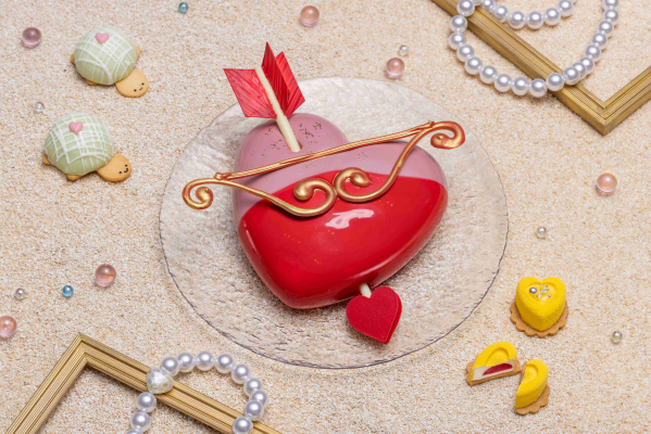 ラズベリーの果肉をラズベリームースで包み、ラズベリージャムを塗ったスポンジの上にのせました。甘酸っぱいラズベリーを存分に味わっていただけるムースです。可愛いハート形は、意中の人の心を射抜く瞬間をイメージしています。