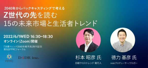 ディー・フォー・ディー・アール株式会社(本社:東京都港区、代表取締役社長:藤元健太郎、以下D4DR)の未来予測専門シンクタンク部門である「Future Perspective Research Center」(以下FPRC *1)は、2022年6月1日に生活者のトレンドを2040年の市場予測からバックキャスティングで考える無料イベントを開催します。本イベントは、2月18日に日経BPより発刊された「消費トレンド2040市場予測―次の20年に生まれる新商品・サービス171―」の発刊を記念したイベントです。