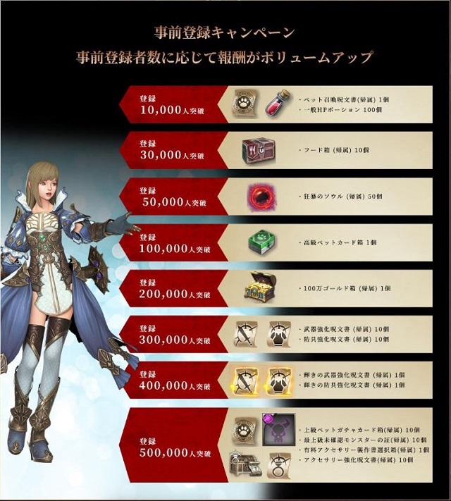 500,000人:上級ペットガチャカード箱(帰属) x 10・最上級未確認モンスターの証(帰属) x 10・有料アクセサリー製作書選択箱(帰属) x 1・アクセサリー強化呪文書(帰属) x 10