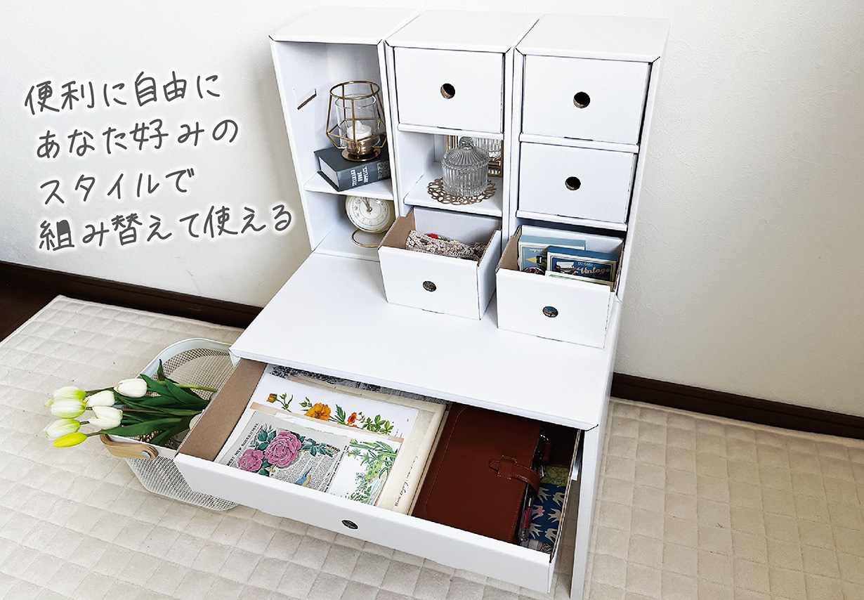 全て段ボールで出来ているので、とても軽く持ち運びも楽々。引っ越し等で不要になった際も簡単に処分が出来ます。