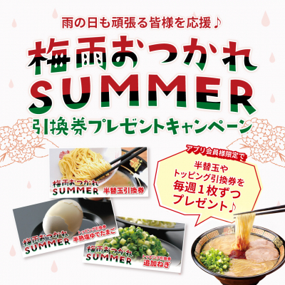 梅雨の中でもお仕事や学業や家事などを頑張る皆様に、美味しいラーメンで気分を上げてもらいたいとの想いから、一蘭公式アプリ会員(麺バー)様限定で、半替玉やトッピングなどの引換券を各週1枚ずつプレゼントいたします。