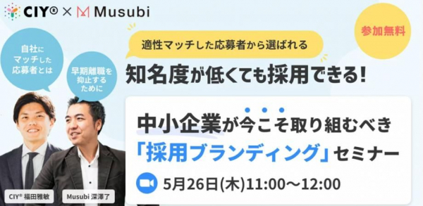 ブランド構築の理論を応用してコンサルティングとクリエイティブを行う、むすび株式会社(本社:東京都目黒区、代表:深澤了)は、2022年5月26日(木)、企業向け採用サービス「CIY(R)(シーアイワイ)適性検査」「CIY(R)(シーアイワイ)ワーク」を展開する株式会社グレード・ビーンズ(本社:福岡県福岡市、代表取締役 CEO:井上 健太郎)と共催セミナー、『知名度が低くても必ず採用できる! 中小企業が、今こそ取り組むべき「採用手段」セミナー』を開催いたします。