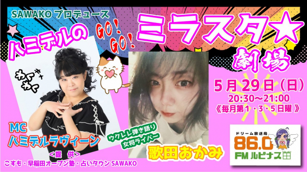 ドリーム放送局・FMルピナス(加藤貴博放送局長)では5月29日、ハミデル・ラヴィーンがMCを務める番組「ハミデルのGO!GO!ミラスタ☆劇場」に、ウクレレ弾き語り女将ライバーの歌田おかみさんがゲスト出演致します。