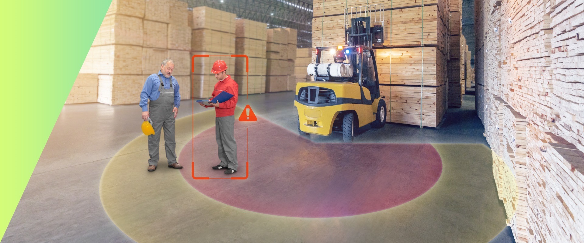 ・車両に接近する人を見つけるとドライバーに警告するピンポイント人物検知技術により、フォークリフトの歩行者事故を防止
