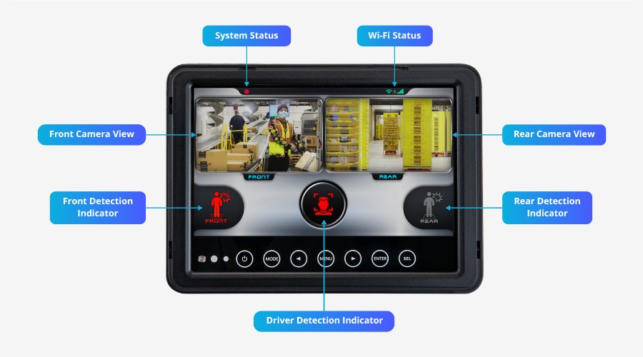 フロントカメラとリアカメラからのライブ映像ストリームを、オプションの7インチCVBSディスプレイに直接配信することが可能です。また、人物を検知するとリアルタイムでビジュアルアラートが表示されるなど、使い勝手のよいインターフェースを備えています。